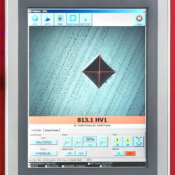 Test loads: from 0,1 to 30 kgf (from 0,98 to 294,21 N) Vickers ISO 6507 / ASTM E-384: HV0,1 - HV0,2 - HV0,3 - HV0,5 - HV1 - HV2 - HV3 - HV5 - HV10 - HV20 - HV30 Knoop ISO 4545 / ASTM E-384: HK0,1 - HK0,2 - HK0,3 - HK0,5 - HK1