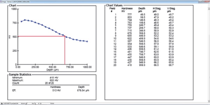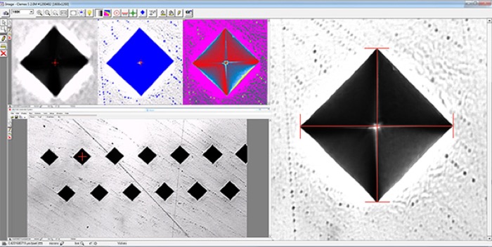The measuring head approaches the specimen and begins the test, following every predefined pattern and performing each indentation, no matter the amount. Results are listed along with the corresponding indentation image, statistics and CHD charts. |